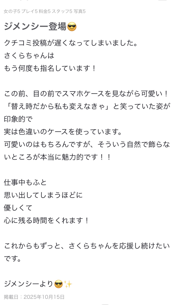 初ノミネートの応援のクチコミをありがとうございます!癒しをもらってるのはさくらのほうですしわたわたさん多忙ななかいつも会いにきてくれて初デリからずーっとさくらを指名し続けてくれてありがとうが溢れます😭❤️🌸さくら🌸 -