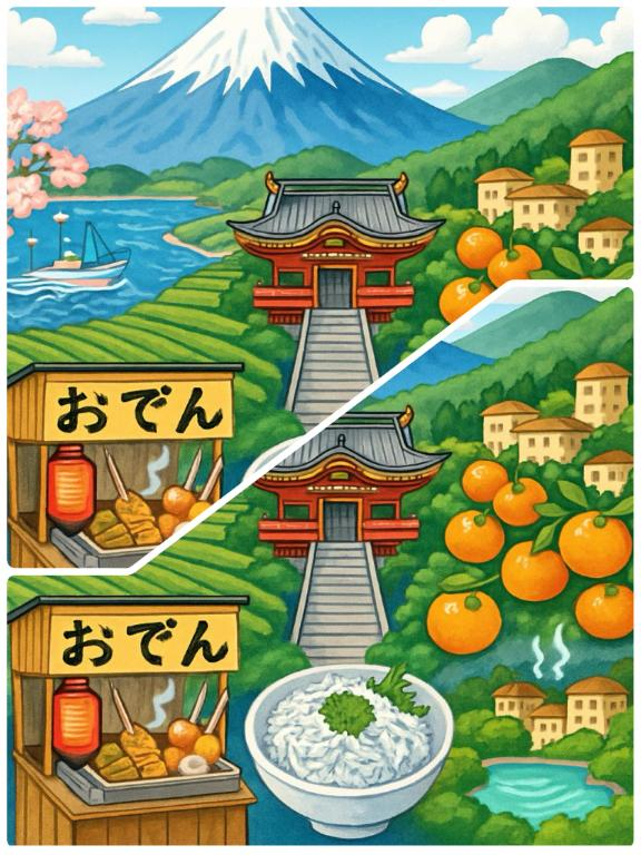 静岡の素晴らしさ真四角の画像しか生成できず、縦長の画面にコラージュでズラしてぜんぶ見えるようにしました ダブって見えるところは あなたさまの御心が感動した衝撃的振動によるものでしょうか