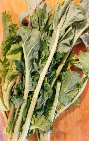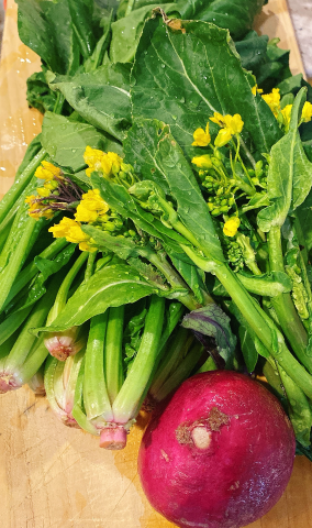 アスパラ菜とほうれん草、赤かぶの、卵とじ